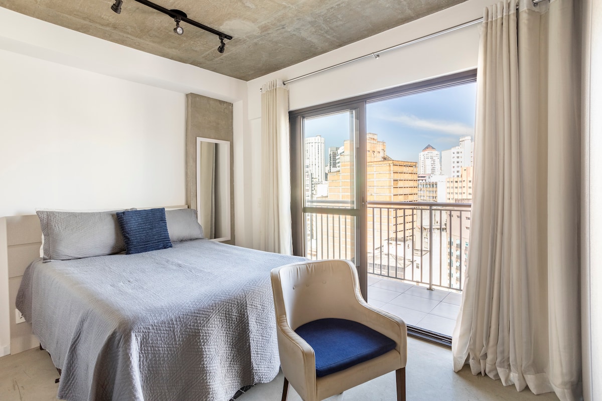 Estúdio espaçoso com muito design, arquitetura e a melhor vista de São Paulo. Loft completo! Com cama queen, closet, ar condicionado silencioso, cozinha completa, home office, WI-FI, TV 55” e uma belíssima banheira de imersão, de onde pode apreciar o seu drink preferido e curtir uma vista apaixonante. São Paulo toda estará há poucos minutos de você. Acesse o metrô andando apenas 200m. Reserve com tranquilidade! Proporcionaremos uma excelente hospedagem e uma ótima experiência!