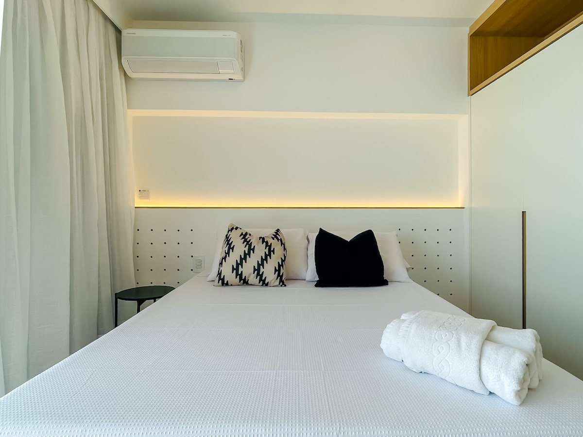 Studio practic, confortabil și elegant. Situat în centrul orașului São Paulo, înconjurat de restaurante premiate și o gamă largă de mijloace de transport. Are tot ce este necesar pentru o ședere scurtă sau lungă. Cu o priveliște senzațională a orașului și a apusului de soare, are aer condiționat cu îngrijire ionică, Smart TV, cuptor cu microunde, frigider duplex, aragaz și cutie de sunet. Parcare sigură și acoperită în interiorul clădirii, piscină și centru de fitness.