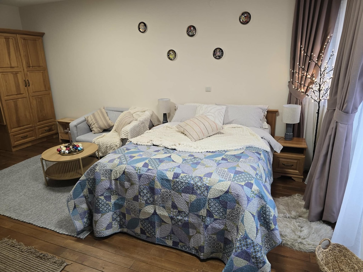 Studioul mare de 39 m2 pentru până la 3 adulți, la 10 minute de gondolă cu o plimbare cu autobuzul de transfer, este cald (are un invertor AC), are Wi-Fi rapid și stabil, bucătărie completă, acces gratuit la un spa frumos, curat și cald, restaurant în apropiere cu mâncare bună și la prețuri accesibile, loc de parcare închis gratuit, spălătorie cu auto-servire. Autobuzul de transfer este disponibil în timpul sezonului de iarnă, programul este consecvent și te conduce: -de la hotel până la gondolă: 8:30, 09:30 -de la gondolă până la hotel: 15:00, 16:30