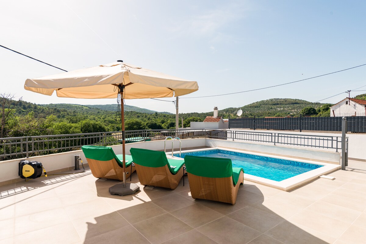 Un apartament rustic frumos situat în satul mic și liniștit, la doar 10 minute cu mașina de costul Adriaticii (orașul Marina). Este ideal pentru oricine caută o vacanță liniștită și relaxată. Apartamentul este situat la etajul propriu și are intrare proprie. Are două dormitoare (unul cu pat matrimonial, unul cu două paturi de o persoană), o cameră comună (TV, AC, WiFi), bucătărie și baie echipate și balcoane pe ambele părți. Piscina, care este doar pentru tine, este situată în afara casei.