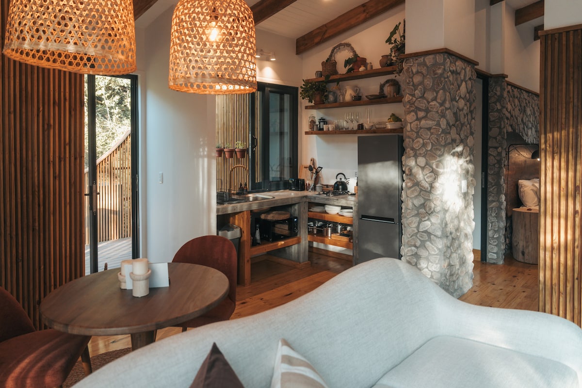 Ridicați printre copacii și ferigi veșnic verzi, veți găsi romanticul Boomhuis care se uită la Munții Outeniqua. Cu ferestre vaste care plutesc peste pădure, acest studio cu un dormitor este conceput în mod intenționat pentru un sentiment reînnoit de semnificație netulburată și reconectare.