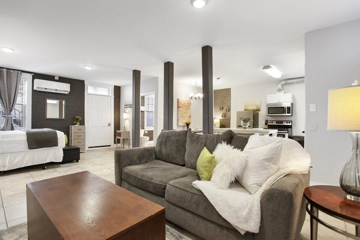 Casă liniștită în copac pe insula Wilmington. Loft39 este un apartament studio cu un dormitor, o evadare elegantă din zona centrală a orașului Savannah. Relaxează-te în baldachinul copacilor într-un apartament privat spațios, cu lenjerie de pat de bambus de lux pe un pat king-size, WiFi de mare viteză, 2 televizoare inteligente, spațiu de lucru dedicat, bucătărie complet echipată cu facilități de bar, baie complet cu duș supradimensionat, living separat și zone de luat masa și consumabile de plajă! Parcare privată în afara străzii inclusă. Autorizație nr. OTC-023656