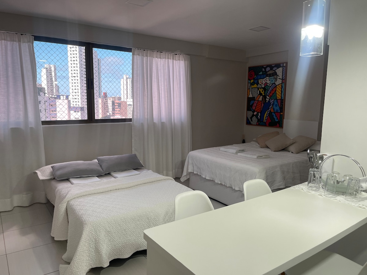 Garsonieră cu vedere la mare, la 15 minute de aeroport și de vechiul centru de recreere și convenții. Clădire veche și tradițională în cel mai popular și sigur loc din Boa Viagem Beach, cu restaurant Seu Tito, bar Alphaiate și cafenea Borsoi la parter, magazin non-stop și supermarket Assaí în apropiere. Ideal pentru oameni practici și dinamici, cu o structură internă bună, bucătărie, Wi-Fi, pat matrimonial, aer condiționat și un duș bun. Al treilea oaspete a fost cazat într-o saltea confortabilă pentru șederi de scurtă durată.