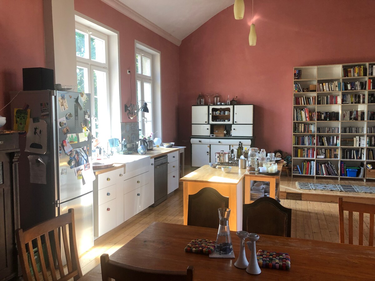 Închiriem un apartament mic în casa noastră de paie din Markkleeberg. Proprietatea este situată în liniște, nu departe de Markkleeberger See. Vei găsi un apartament cu 1 cameră într-o locație liniștită, cu bucătărie proprie și baie mică. Zona exterioară te invită să zăbovești. Între găini şi raţe te poţi relaxa minunat. De asemenea, foarte potrivit pentru copii și familii. Variate destinații excursie în mediul rural posibil. 15 minute de mers cu mașina de centrul Leipzig (masina).