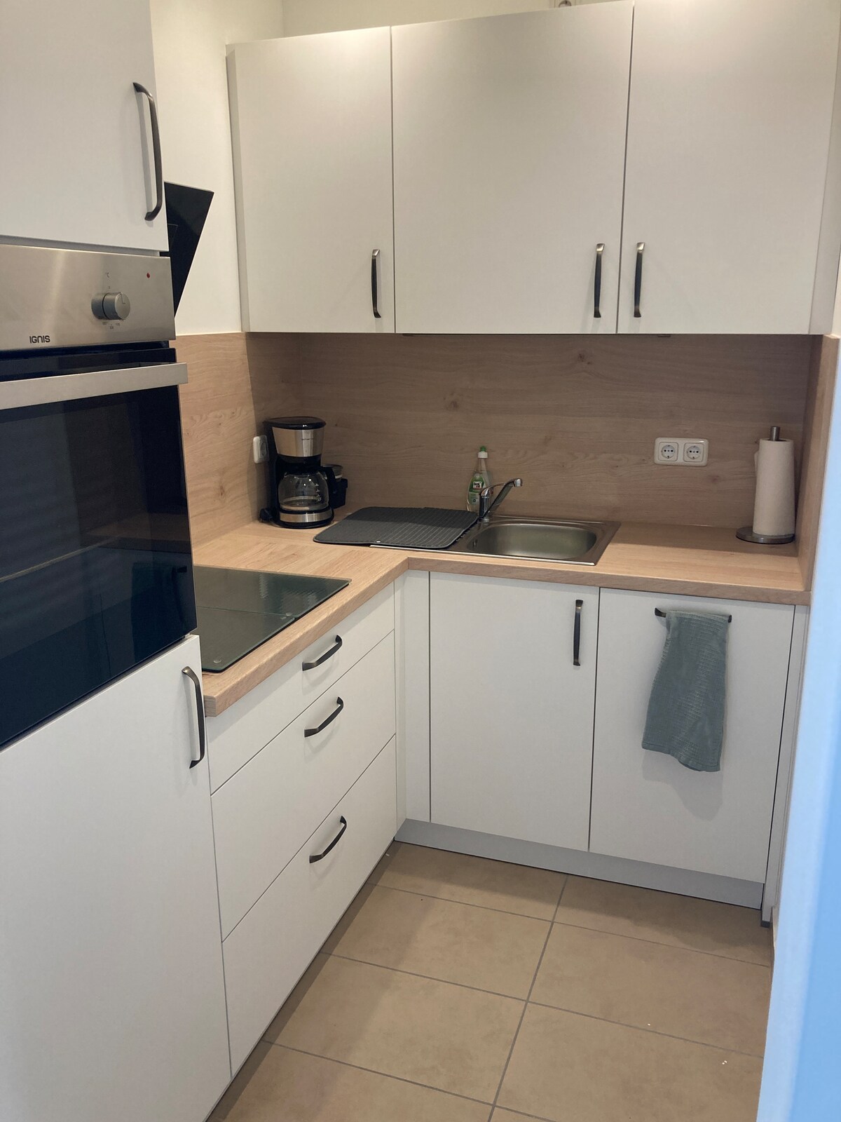 Inima apartamentului este livingul spațios și inundat de lumină, cu zonă de luat masa și o canapea extensibilă de înaltă calitate. Bucătăria complet echipată oferă tot ce îți trebuie. Baie mică, elegantă, cu duș cu efect de ploaie pentru relaxare. Din living, poți ieși pe terasă cu scaune. Apartamentul este situat central, dar liniștit. Cumpărăturile, cafenelele, restaurantele și principalele atracții se află la câțiva pași.