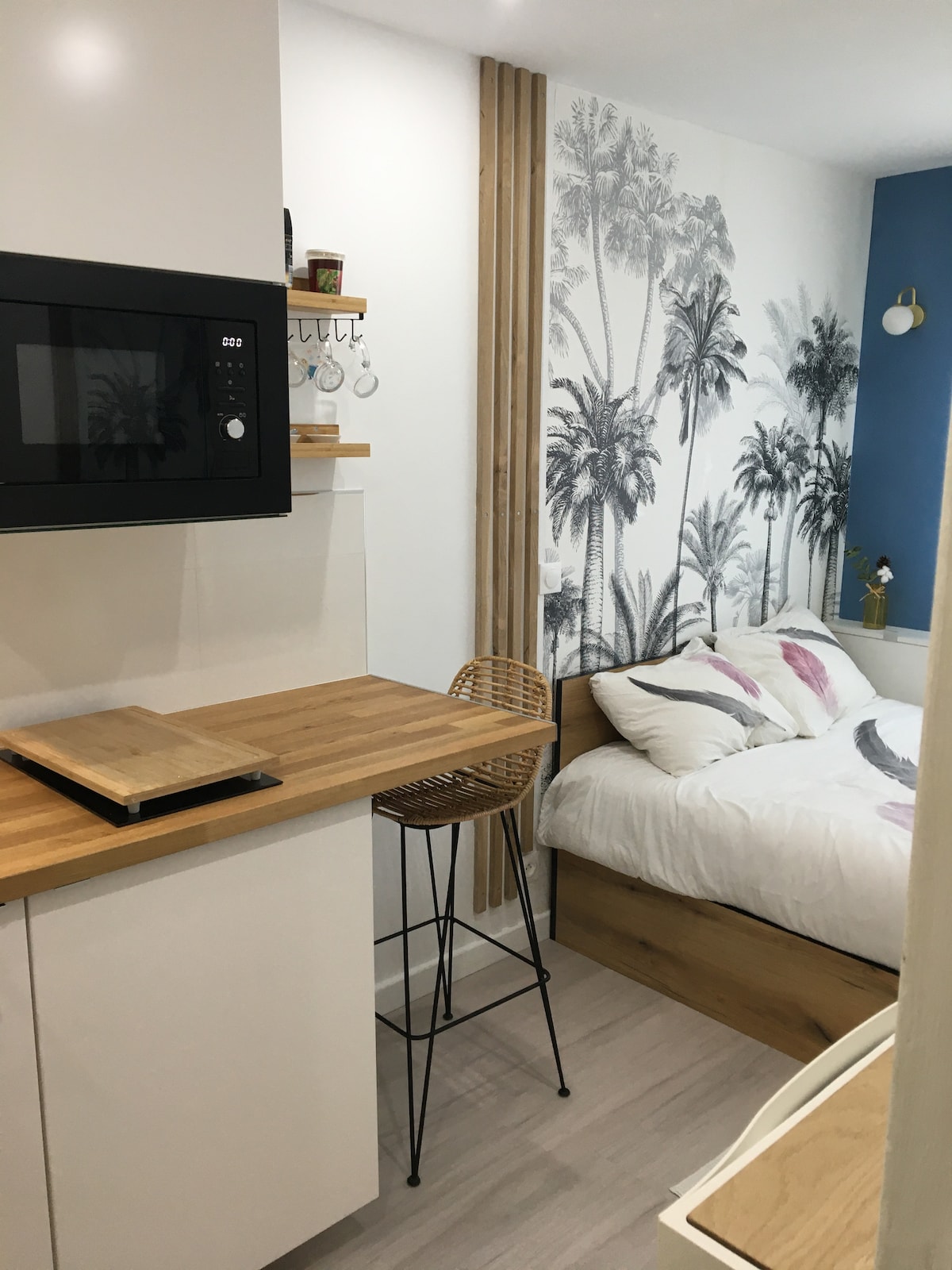 Studio liniștit, luminos și confortabil, renovat cu gust și materiale de lux. Fereastră mare cu vedere la grădina clădirii, altfel nu vei fi trecut cu vederea. Aspectul său ultra-optimizat te va face să uiți de dimensiunea sa mică. Totul este mobilat cu un pat dublu adevărat, odihna ta va fi confortabilă. Garsoniera este complet echipată, duș/toaletă în interior, prăjitor de pâine, aparat de cafea Nespresso, mașina de spălat vase sunt la dispoziția ta pentru șederea ta. Hârtia igienică/pernele/prosoapele sunt toate furnizate.