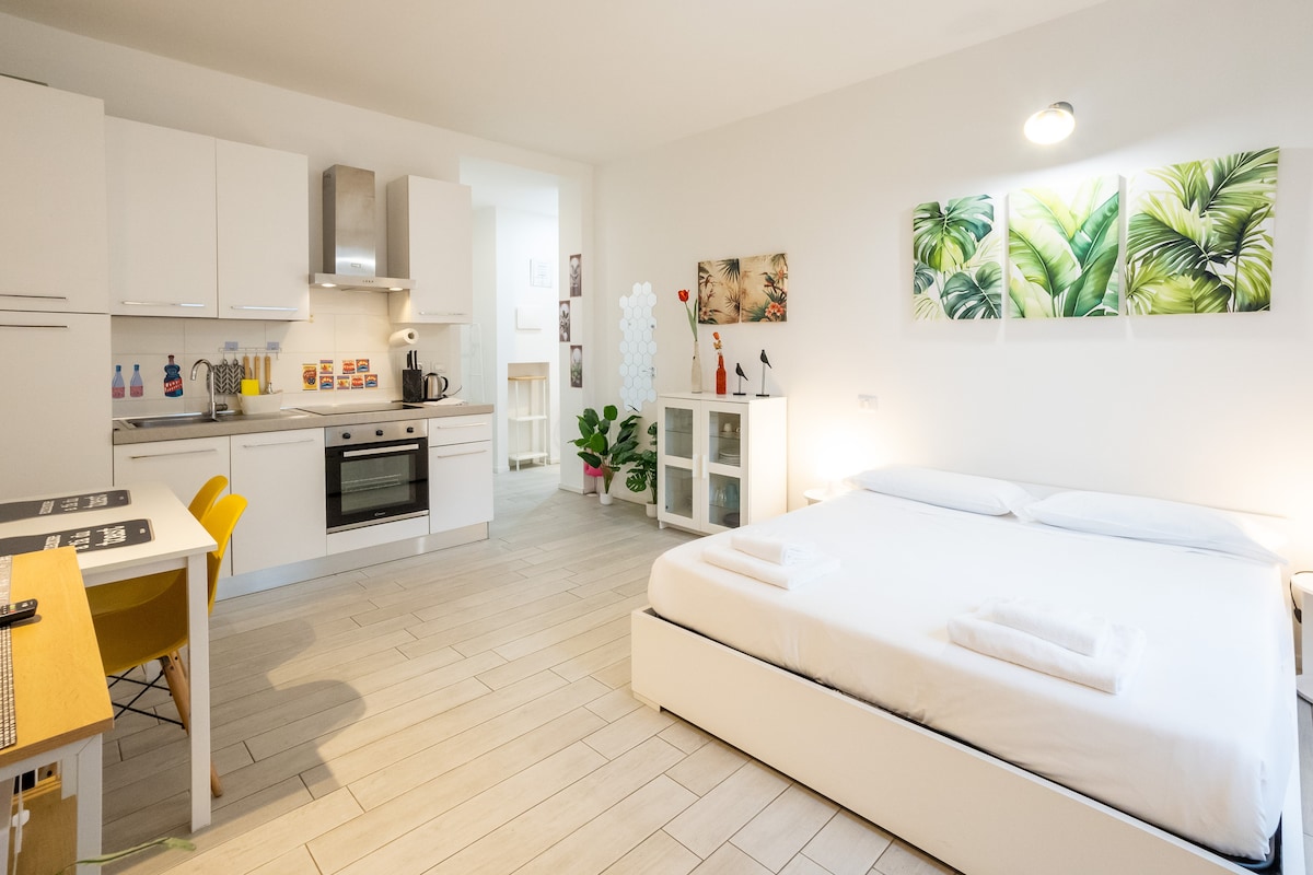 Apartament liniștit, confortabil și confortabil de 30m2 la parter, compus dintr-un spațiu deschis care poate fi împărțit în două zone separate și o baie. Wi-Fi gratuit, aer condiționat și ferestre în fiecare cameră. Distanța de mers pe jos față de Piazza Maggiore, Universitatea din Bologna și Ospedale Malpighi Sant 'Orsola. 10 minute cu autobuzul până la și de la Gara Centrală și Bologna Fiere. Oferim, de asemenea, depozitare gratuită a bagajelor pentru check-in / check-out în același apartament cu Ninfee Studio.