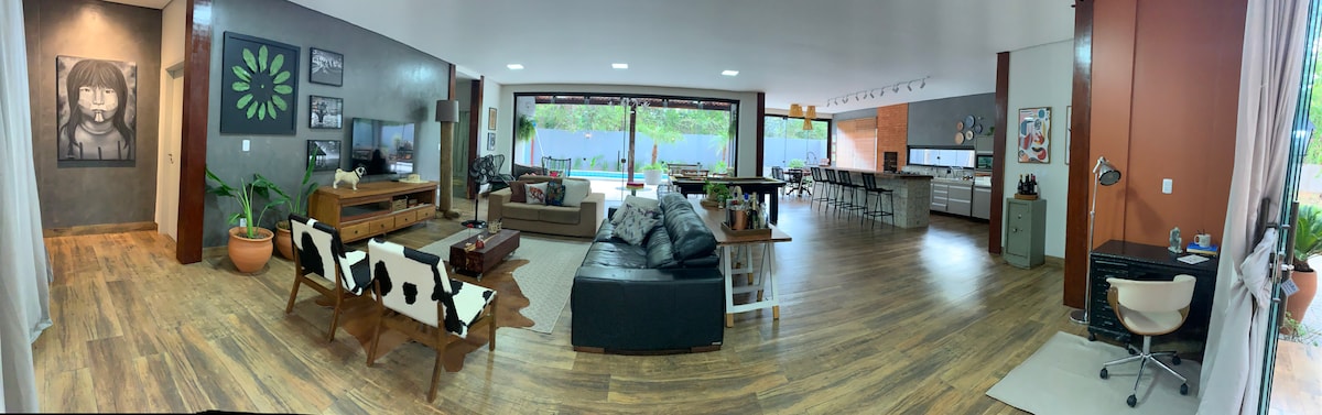 casă cu un mediu integrat, cu stil rustic și confort urban, confortabil, plin de afecțiune și personalitate în detalii, în Parcul Tarumã, un cartier fermecător din Bonito, pentru rusticitatea, peisajele și natura sa. Bucură-te de pădurea din fața casei, piscina cu plajă delicioasă, adună-i pe cei cărora le place un grătar cu piscină după tururi și relaxează-te într-un spațiu care are o atmosferă foarte locală. Sperăm să ne împărtășești sentimentul de bucurie și bun venit care ne-a adus aici!!