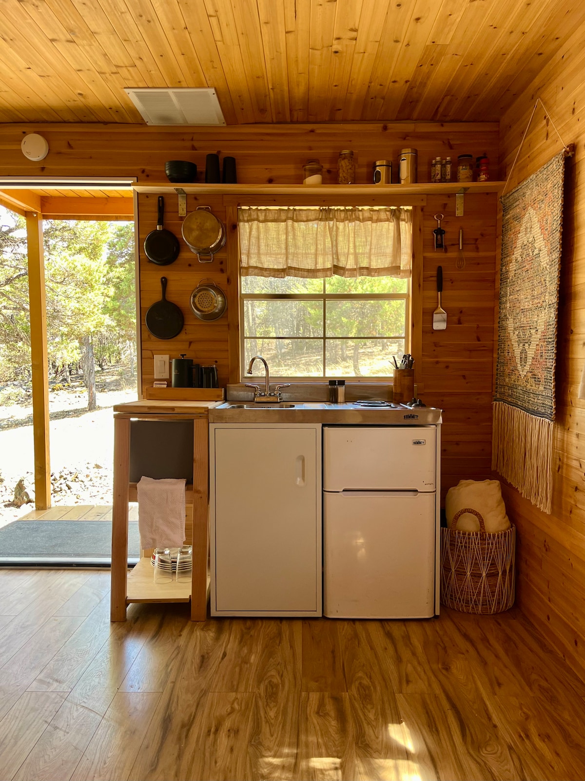 O cabană mică, dar confortabilă, încălzită de radiatorul nostru cu kerosen iarna și cu un aparat de aer condiționat mic pentru valurile de căldură de vară. Veranda întreținută de sora mea este caldă în zilele însorite de iarnă și răcoroasă vara. Proprietatea noastră este liniștită, doar mama mea, sora mea și nepotul surorii mele locuind în celelalte două locuințe de pe proprietatea de trei acri. Oferim intimitate deplină pentru cei care o preferă; sau, pentru cei care o apreciază, ne place să ne întâlnim cu oaspeții noștri și să îi primim cu drag.