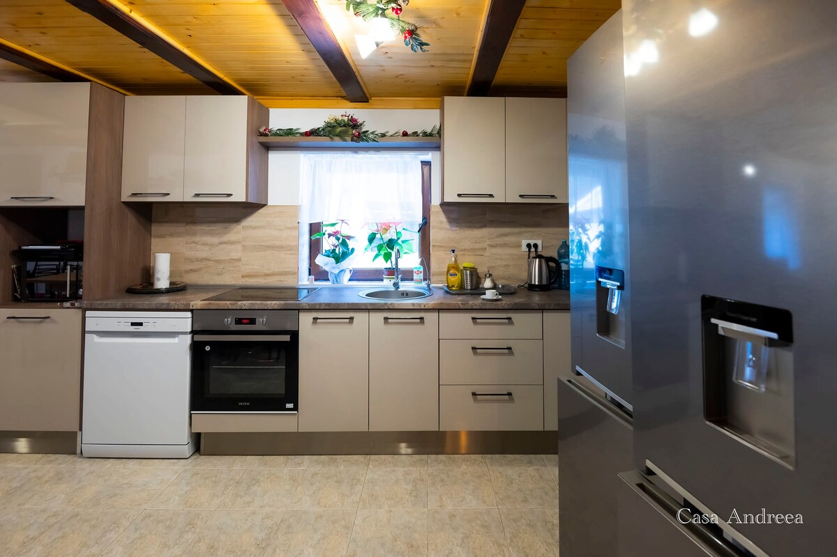 Bucatarie complet utilata, frigider, plita electrica,cuptor mare, cuptor cu microunde,loc de luat masa , vesela. Toate camerele , inclusiv livingul au smart tv.Gratar exterior.WiFi gratuit pe toata proprietatea.Parcare gratuita in curte cu supraveghere video. La nevoie se poate asigura transport in diferite locatii ! Cel mai apropiat supermarket se afla la 800 de metri, cel mai apropiat restaurant la 5 kilometri!
