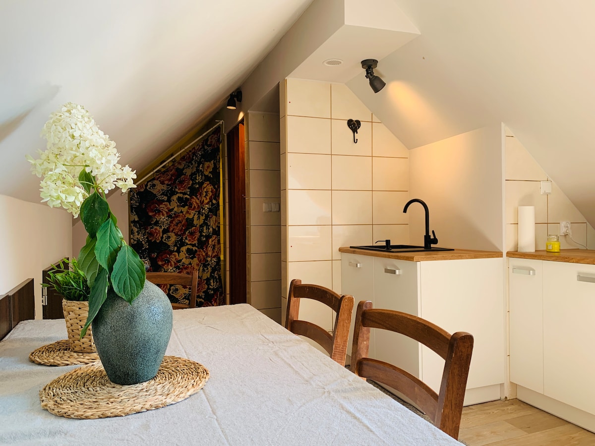 Acest apartament unic ocupă mansarda unei clădiri istorice, care face parte dintr-un complex de clădiri rurale. Oaspeții au la dispoziție 80 m2 cu intrare separată. Apartamentul este format dintr-un living mare cu un colț pentru copii, 2 dormitoare, o bucătărie complet utilată, o sufragerie cu o masă mare și o baie. La cererea oaspeților, oferim o pivniță istorică, unde puteți petrece o seară plăcută lângă șemineu și un pahar de vin. Vă rugăm să ne anunțați dacă doriți să folosiți pivnița după efectuarea rezervării sau după sosire.