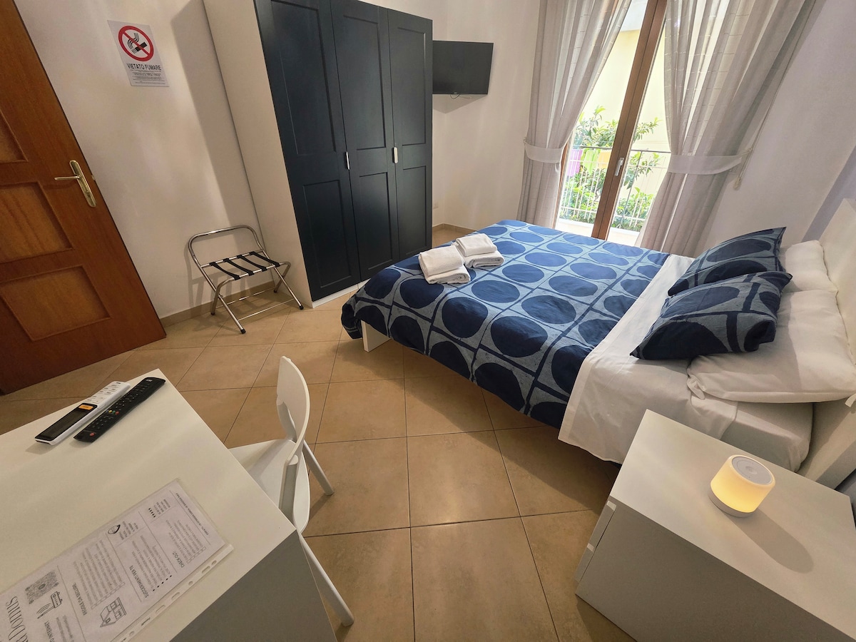 Il letto matrimoniale è posizionato di fronte ad una grande finestra che affaccia sul Corso principale della città e, dalla quale, si vede il mare. In camera troverete inoltre un divano letto. Il bagno, all'interno della stanza è dotato di doccia. The double bed is positioned in front of a large window overlooking the main street of the city and, from which, you see the sea. In the roon you will also find a sofa bed. The bathroom, inside the room is equipped with shower.