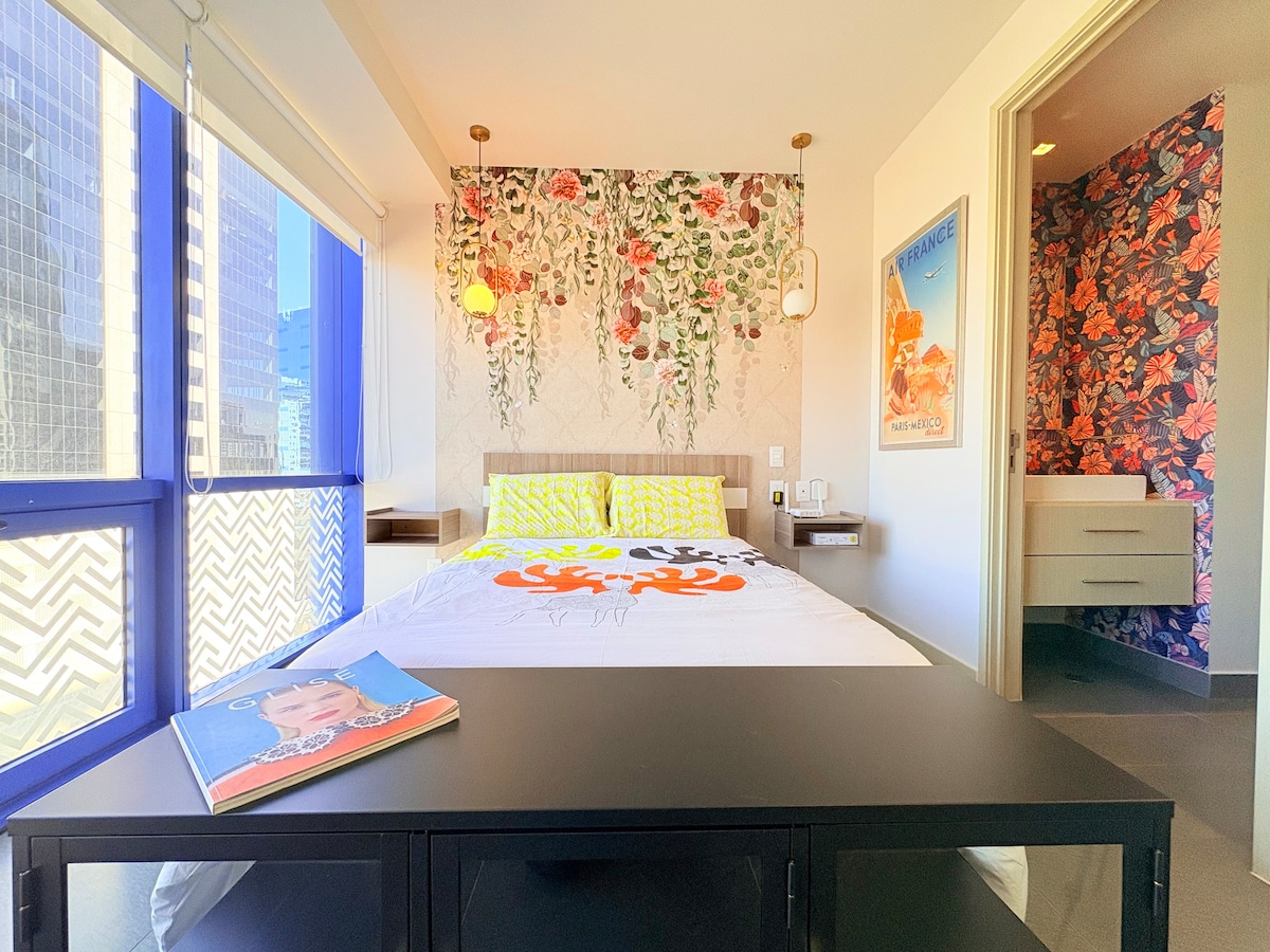 Apartament frumos în City Grand Suites, exclusiv pentru tine! Ideal pentru muncă la distanță sau călătorii de agrement, oferă Wi-Fi, parcare, un lift, o sală de gimnastică, o spălătorie și o priveliște spectaculoasă de pe terasa clădirii. Locație excelentă într-un cartier sigur lângă Interlomas, aproape de restaurante, supermarketuri și centre comerciale. Acces direct cu o încuietoare digitală, este complet echipat și curat pentru o ședere excelentă, la fel ca acasă.