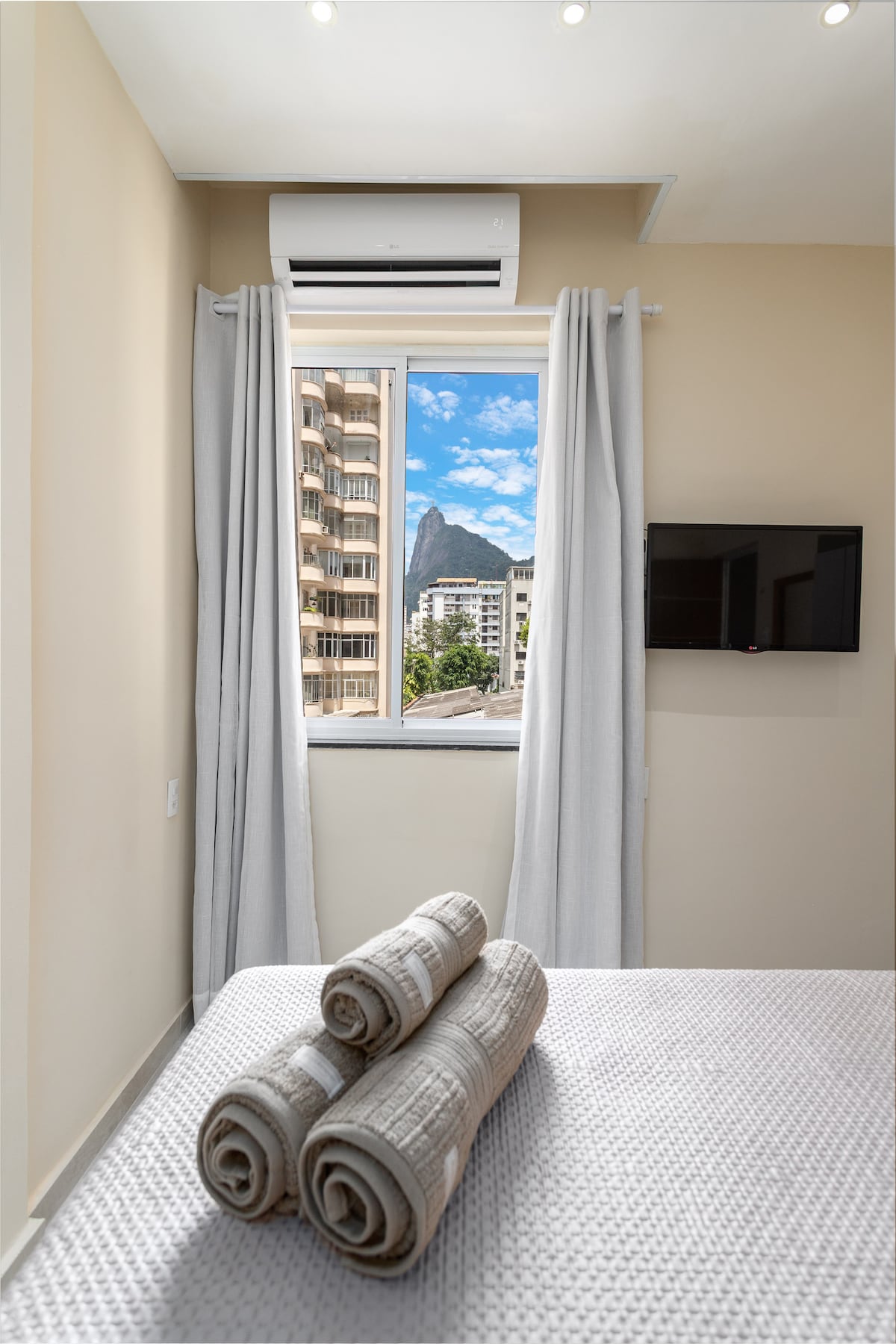 Apartament Otimo, decorat, super compact și funcțional, cu CEA MAI FRUMOASĂ și privilegiată PRIVELIȘTE a orașului, care este Hristos Răscumpărătorul văzut prin fereastră și cu Pao de Açucar, un alt loc turistic uimitor în partea din față a imobilului. Espaço are un internet de 350 Mega, ceea ce face posibilă efectuarea apelului video într-un loc liniștit și liniștit. Conform regulilor condominiului, check-in-ul trebuie făcut până la ora 19:00.