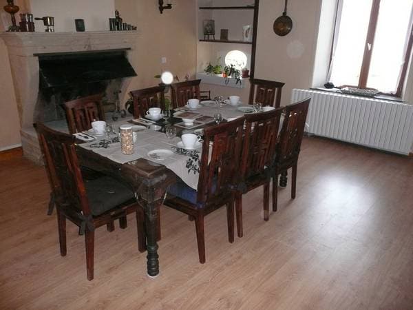 În acest sat mic se află frumoasa noastră cabană din lemn, cu trei dormitoare spațioase și paturi bune (serios!). Există acum 3 băi, iar în garaj poți face locuri de muncă, ping-pong și sală de gimnastică. În grădină există diverse zone de relaxare pe terasă și pe iarbă; desigur, am lăsat marginile grădinii pentru fluturi și albine. Există multe de făcut în zona împădurită, dacă îți place ciclismul, drumețiile și sporturile. Charleville-Meziers este la 25 de minute de mers cu mașina pentru cumpărături, mâncare și luat masa!
