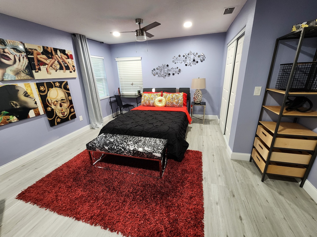 ACEST SPAȚIU ESTE DESTINAT EXCLUSIV UTILIZĂRII DE CĂTRE DOI OASPEȚI. Primești întregul apartament. Ideal pentru o escapadă romantică sau doar pentru o călătorie de afaceri sau o vacanță. Distanță pe jos până la Seminole Hard Rock & Casino. Are o chicinetă, un pat matrimonial confortabil, baie, TV de 65”(Roku), internet (Wi-Fi) și intrare privată. Situat în apropiere de multe atracții (Bush Garden, Adventure Island Parks, centru, restaurante și târguri de stat din Florida)