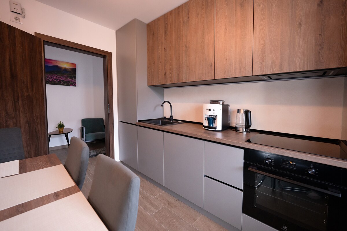Apartament ultramodern, complet utilat, cu parcare privata, dotat cu incuietoare inteligenta pentru check in/check out. Este situat in cel mai modern complex residential din Brasov - Cartier Coresi, langa centrul comercial Coresi Shopping Resort, la 10 minute de centrul istoric. Dispune de un dormitor cu pat matrimonial, living cu canapea extensibila, bucatarie complet echipata, aer conditionat, terasa mare cu hamac, masina de spalat rufe/vase, doua televizoare 4k cu Netflix si HBO Go.