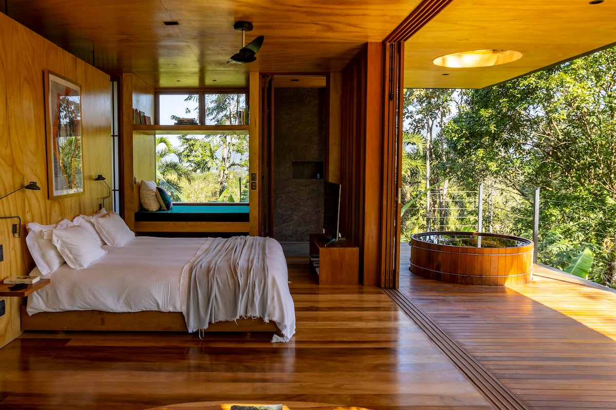 Această nouă cabană din mijlocul junglei și de pe terenul Fazenda Ressaca este pentru cei care apreciază designul bun și sunt în căutarea păcii, a confortului și a unui contact profund cu natura. Creată ca un cocon pentru a experimenta și a se conecta cu rezervația exuberantă a pădurii tropicale atlantice de peste 700.000 de metri pătrați, această cabană a fost concepută pentru o experiență de neuitat de relaxare și bucurie. Plus menaj zilnic și produse locale proaspete (unele de la fermă) pentru a pregăti micul dejun.
