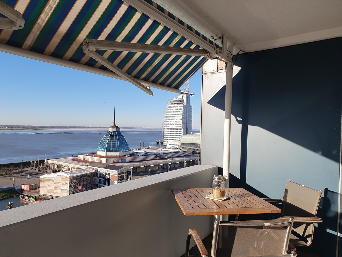 CaptainsLodge: Locație centrală de top cu vedere panoramică la Weser și Havenwelten! Cea mai frumoasă priveliște din Bremerhaven: O fereastră frontală cu balcon în față se întinde pe întreaga lungime a apartamentului - astfel încât să aveți o vedere unică asupra "lumilor portuare" din Bremerhaven peste Weserdeich și Weser spre Nordenham (de cealaltă parte a Weser). Apartamentul are o suprafață de aproximativ 55m2 și este situat în partea de vest a unui turn al așa-numitului "centru Columbus". Acesta a fost complet renovat și mobilat în vara anului 2010.