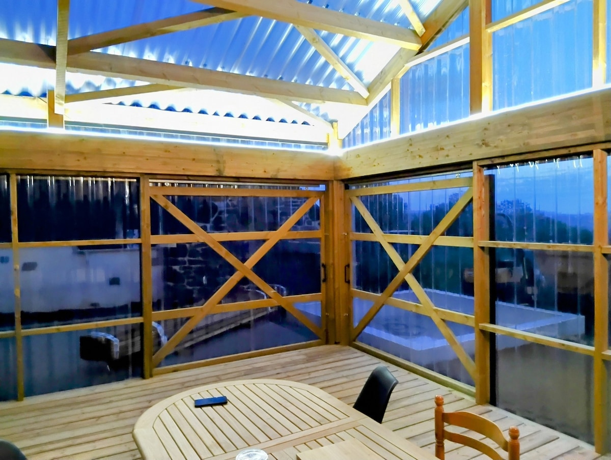 Atypique et unique dans sa localisation en plein bourg et dans sa conception. Vue sur l’aber ildut et la mer d’Iroise. Dans la verdure et à l’abri. Une partie habitation et une autre en jardin d’hiver sur parquet avec sauna infrarouge.