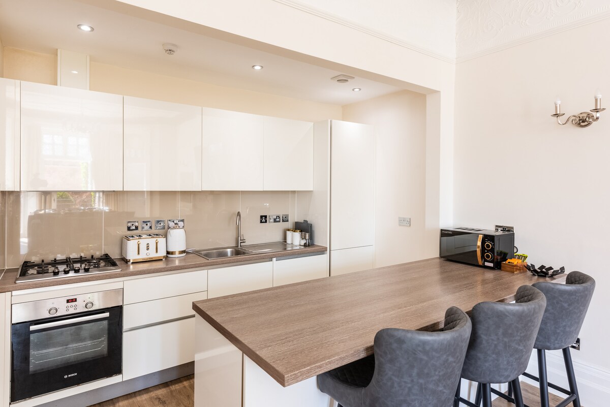Un apartament minunat cu trei dormitoare la parter, cu grădină privată, la numai 1 minut de peluze și plajă. Strict fără petreceri. Apartamentul are multe piese de epocă uimitoare, de la tavane duble cu înălțime, cu înveliș decorativ, șeminee originale, uși din sticlă pătată și parchet. Avem trei dormitoare mari cu paturi matrimoniale și saltea cu spumă cu memorie. Trei dușuri/băi. Wi-Fi de mare viteză. Bucătărie complet echipată și sală de mese și un televizor inteligent LG de 60”.