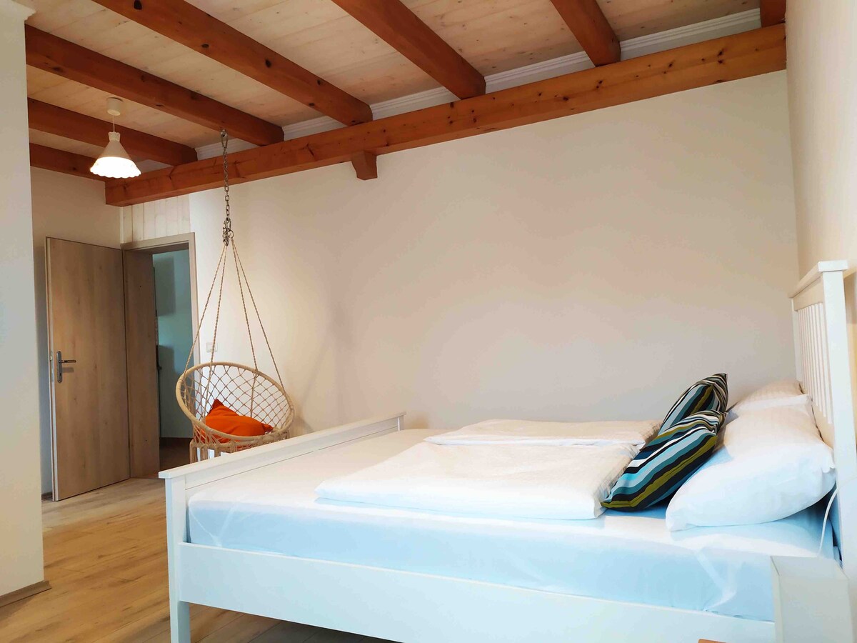 This charming 48m² apartment is ideal for families or couples. It features one bedroom with a 160x200 bed. The kitchen is fully equipped, including a dining area. Additional amenities include satellite TV, air-conditioning, and a sofa bed (140x200) that can accommodate 2 children or 1 adult. A buffet breakfast is included in the price and is served on the ground floor in a cozy tavern or in the garden, depending on the weather. Guests can enjoy a shared terrace with other visitors.