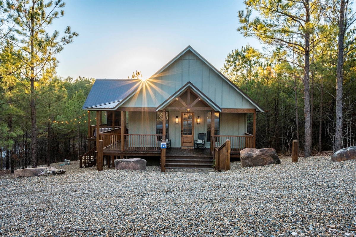 Cabană modernă de lux | 2 apartamente King • Încărcător EV • Potrivită pentru animale de companie Descoperă The Modern, o cabană uimitoare, orientată spre design, pe 3,5 acri privați în Broken Bow. Dispunând de tavane înalte de 18 picioare, ferestre mari, o bucătărie complet albă, aragaz cu lemne și 2 apartamente matrimoniale luxoase (una cu cadă cu hidromasaj). Bucură-te de priveliștea pădurii, relaxează-te lângă foc și încarcă-ți vehiculul electric la fața locului. Și potrivită pentru câini! Rezervă-ți astăzi escapada de neuitat.