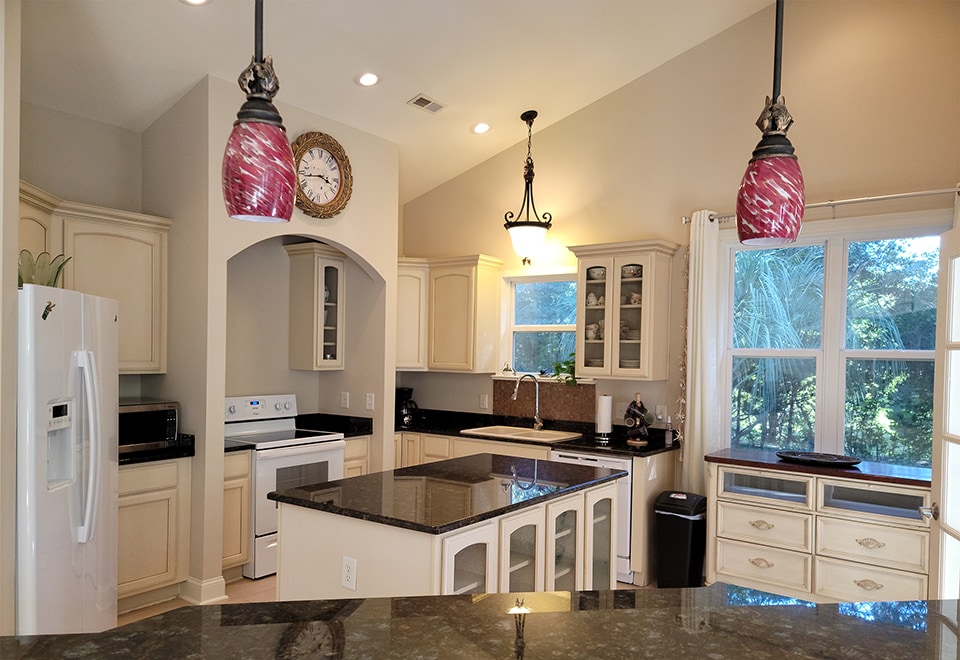 Charming 5-star home; WELCOME SNOWBIRDS SEPT-APRIL 45% discount. Huntington Beach (FREE pass) and Brookgreen just 5 mins away! Back yard oasis w/in-ground pool (seasonal) 9’ ceilings, hardwoods/rugs. Airy but cozy. 2160 sf & 2 living areas - one level. Bedrooms: 1 K BR w en suite; 2 Q BRs w shared full double-vanity BA. Fully-equipped K w island. Quiet country lane yet 5 mins. to restaurants & shops of Marshwalk. Relax on porch w rockers and swing. No motorcycles. Yes to 35 lb dogs (max 2)
