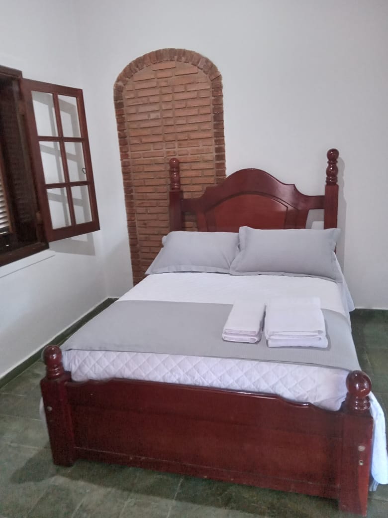 1 suíte confortável com cama de casal e cama de solteiro, ar condicionado, TV 40” com canais abertos, banheiro completo, e varanda.