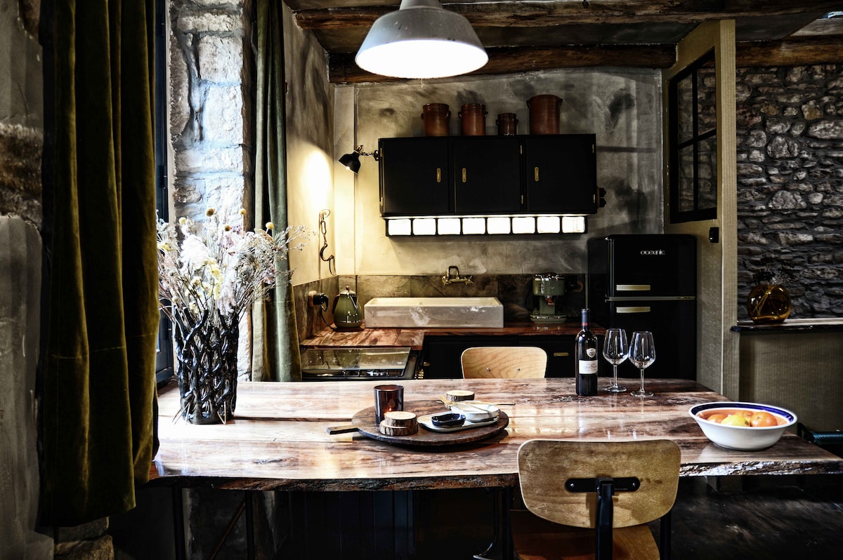 Maison Emye, o adevărată bijuterie și un loc plin de caracter în inima orașului Montpeyroux. Descoperă o bucătărie luminoasă care deservește două niveluri confortabile. Oferă o baie cu o cadă mare, urmată de un living spațios cu pereți la vedere, tavan înalt, o canapea extensibilă și o zonă de dormit liniștită. Există, de asemenea, o masă din lemn și o terasă privată pentru a te bucura de o baie sub stele. La etaj, fiecare detaliu evocă liniștea unui apartament elegant, dotat cu videoproiector și duș pentru două persoane.