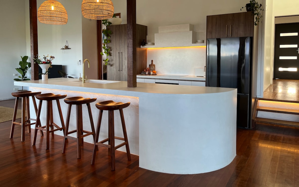 Bine ai venit la The Cabin, un refugiu romantic preferat de oaspeți, amplasat printre copaci cu priveliști spre ocean, la doar 7 minute de Burleigh Beach, magazinele la modă de pe James St, restaurante și baruri de pe Gold Coast. Savurează o cină șic, apoi relaxează-te lângă șemineu cu vin și bezele sub stele. Acest refugiu are un șemineu elegant din piatră (fals), interioare șic și grădini luxuriante cu mai multe zone de relaxare pentru a te reîncărca. Perfect pentru cuplurile care caută o atmosferă liniștită în natură, lângă plaja vibrantă Burleigh!