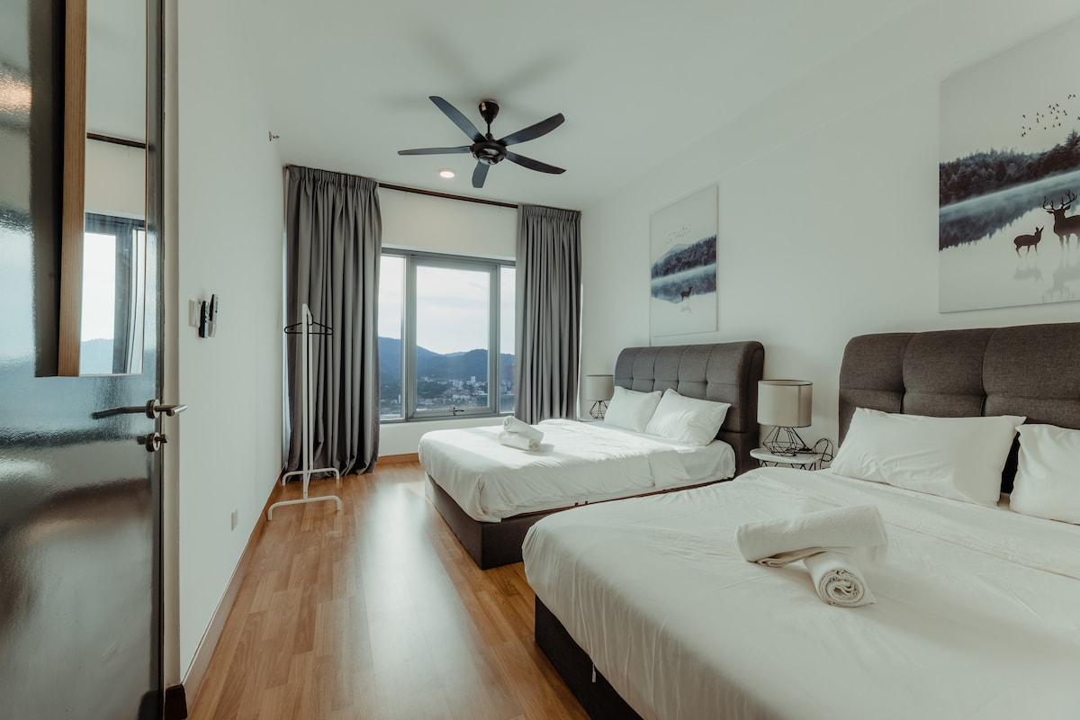 Singurul loc de cazare de lux de-a lungul plajei Batu Ferringhi cu acces direct la plajă, literalmente trebuie doar să ieși din apartament pentru a te bucura de activități la mare, plajă și apă. Breezy 2 dormitoare pentru 5 adulți: 1 pat king-size, 1 pat queen-size și o canapea extensibilă în living. Piscină pe malul mării, sală de gimnastică modernă, loc de joacă Wi-Fi gratuit și TV prin cablu, parcare Cea mai bună locație pentru a explora zona Batu Ferringhi și la câțiva pași de restaurantele, barurile, centrele spa, galeriile și restaurantele occidentale locale