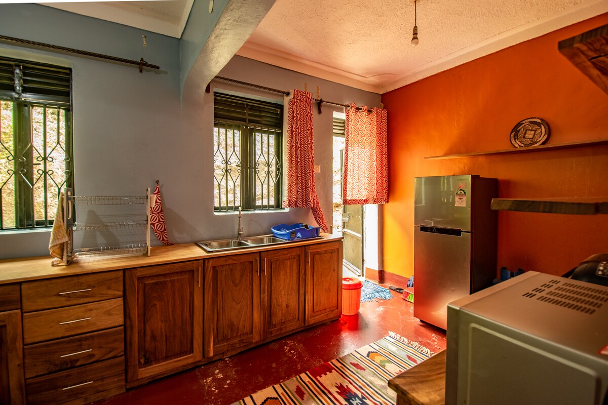 Relax with the whole family at this peaceful place. Turked away from the town hustle and bustle wake up to the sound of birds, fresh air and a calm serene space. Feel free to stay indoors and play board games, watch your favorite movie or enjoy the outdoors playing volleyball and lay on the pouch to watch the beautiful sunset. Wind down the day at the fire place listening to some cool music, have a karaoke night or simply fall in the sofa for a Netflix movie night. Next day hike Sipi falls!