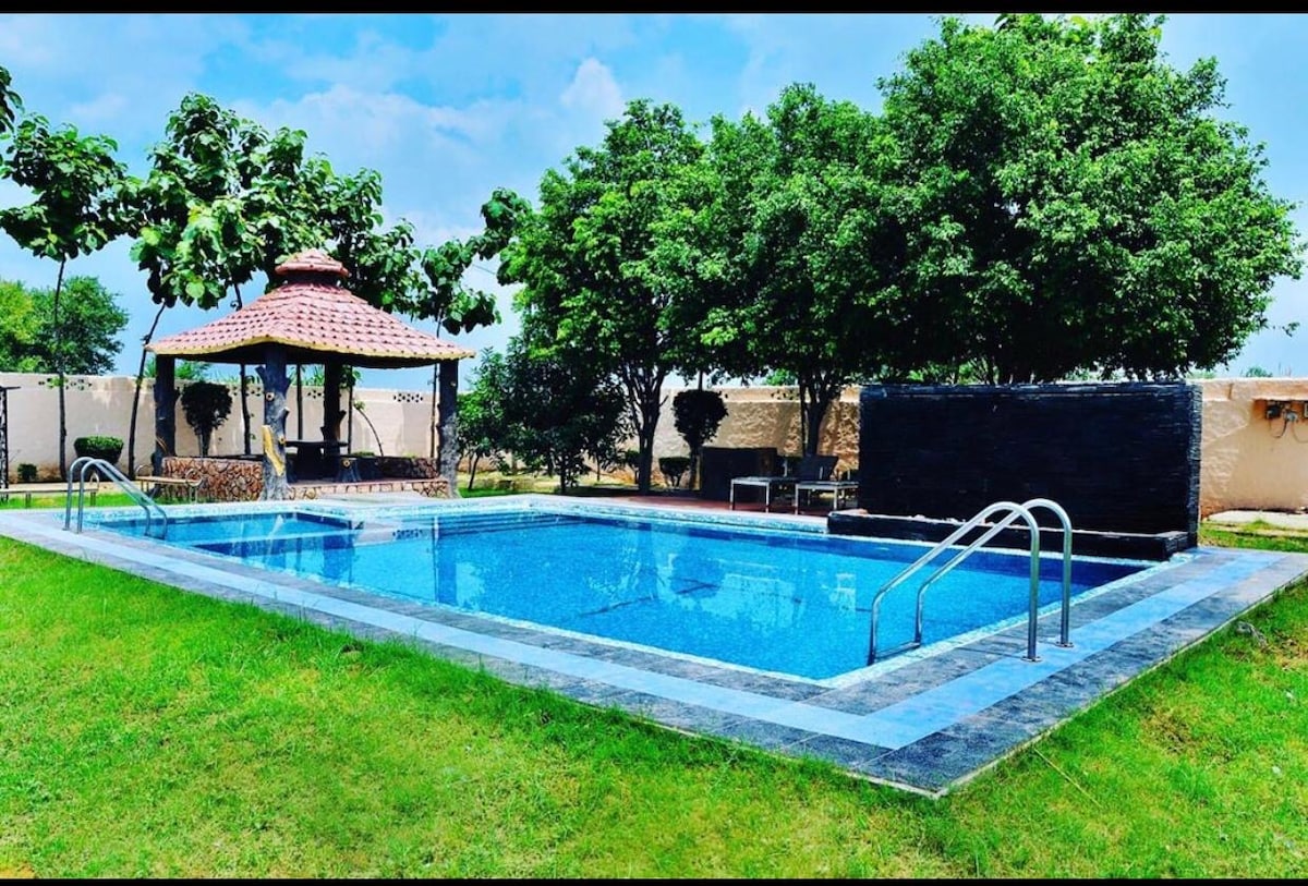 Just 2 hrs from NCR, A farmhouse comprising of Oasis suite and a cozy log hut, 40+ lush mango trees and pure, oxygen-rich air. Refresh with a tube well bath, enjoy homemade meals and unwind by a bonfire under the stars. For entertainment, we offer karaoke and projection cinema. With hi-speed Wi-Fi, CCTV security, and exclusive service staff, your comfort and safety are assured. Accessible via a motorable road with secure parking, this pet-friendly haven is your ideal escape into nature.