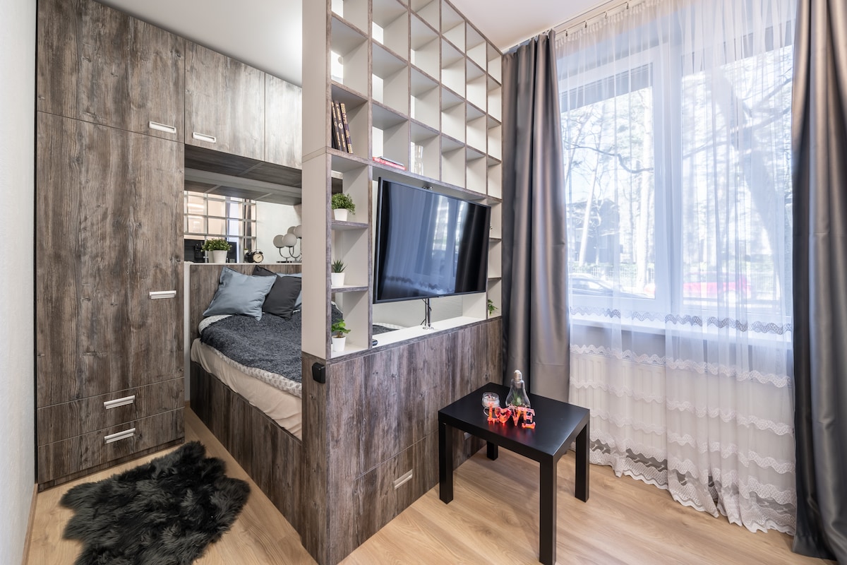 Hello. Our cozy apartment is located in the center of Jurmala, Dzintari station, just opposite the large Dzintaru Mežaparks park in the modern Edinburg apartment &lofts building. The apartment has one bedroom, large living room with kitchen and a balcony, which is rightfully considered part of the living space. Warm tones, a lot of wood and local fabric will bring you to the relaxing atmosphere of Jurmala’s country house.
