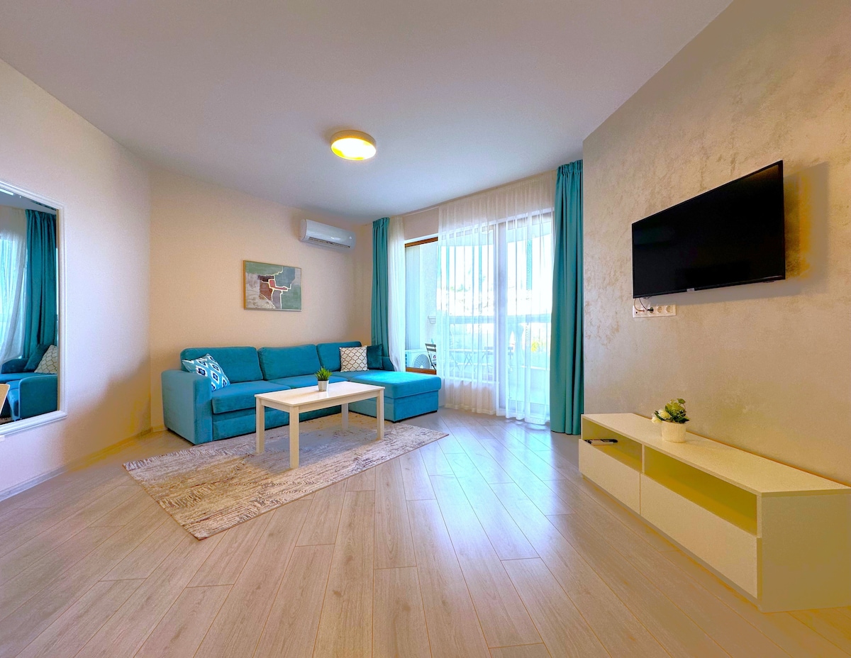 Apartament elegant în Harmony Suites Grand Resort, cu piscine frumoase, grădini și un balcon însorit. Ideal pentru cupluri, familii mici și oaspeți care caută un sejur relaxant în Sunny Beach. Apartamentul oferă Wi-Fi rapid, o bucătărie complet utilată, o zonă de living confortabilă și tot ce îți trebuie pentru o ședere plăcută în timpul verii. Plaja este la aproximativ 600 m distanță, iar Nessebar este, de asemenea, ușor de accesat. Perfect pentru vacanțe la plajă, zile la piscină și seri relaxante într-un complex de înaltă calitate.