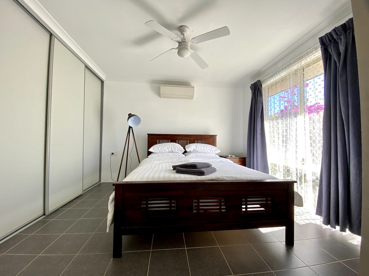 Keep it simple at this peaceful and centrally located place. Located at the back of the main house, this fully contained and wheelchair-friendly guesthouse is only a walking distance to Maiden Reserve and less than 2 km to Mindalong Beach. Smart TV, sofa bed, reversed air conditioner and fan with comfy queen size bed with quality linen and towels. Toilet, shower and kitchenette (including microwave, fridge, air fryer, electric frying pan and basic utensils).