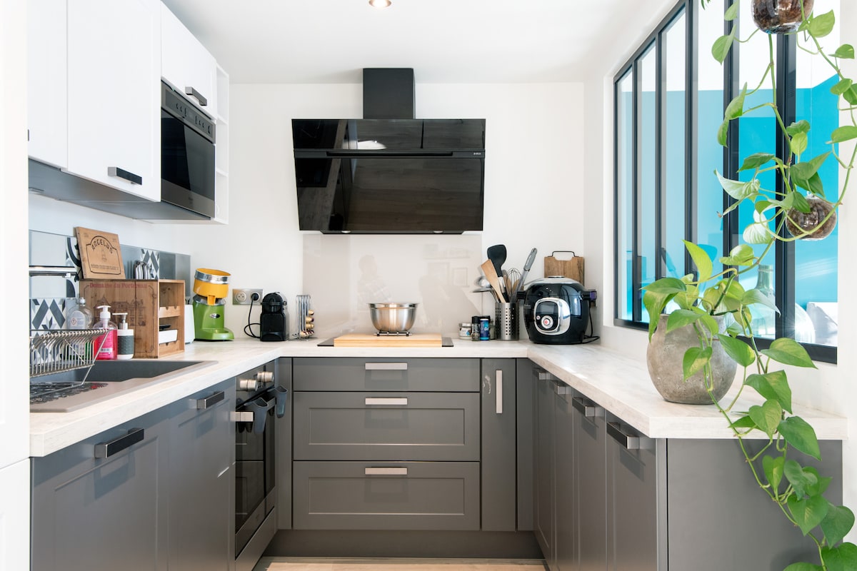 T2 complet renovat în portul vechi de la poalele turnurilor. 45 m2 disponibil într-un living frumos cu o bucătărie complet echipată, iar pentru zona de living, o canapea confortabilă pentru odihnă după plimbările iodată. TV și Wi-Fi incluse. Baie cu baie independentă în dormitor. Mașina de spălat și uscătorul sunt la dispoziția dvs. Toaletă separată. Dormitor frumos cu un pat matrimonial, dressing și birou cu vedere la o curte interioară pentru nopți liniștite.