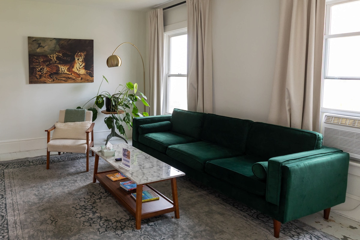 Bucură-te de o experiență elegantă și confortabilă în această locuință convenabilă, situată central. Scurtă plimbare până la peste o duzină de restaurante locale, cafenele, sală de gimnastică și dotări și la doar 5 mile de mers cu mașina până la frumosul lac Champlain și parcul de golf St Albans. Apartamentul este recent renovat într-un stil boho confortabil, cu intenția de a oferi confort și dotări oaspeților Airbnb. Clădirea din cărămidă a fost construită în 1830 și este bogată în frumusețe istorică. Un loc minunat pentru o ședere confortabilă și plăcută în Vermont!