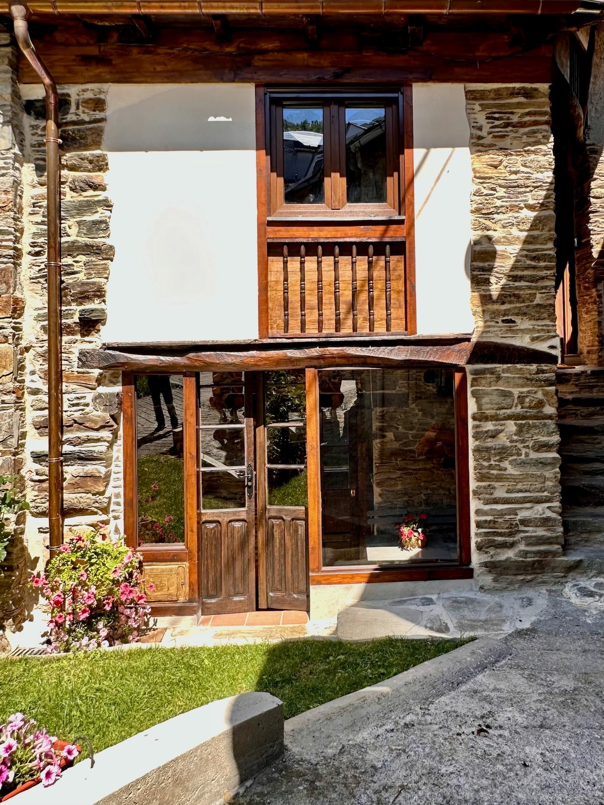 Casa rústica familiar de piedra y madera, antigua y típica casa de labranza de la montaña berciana con capacidad para 4 personas. Consta de dos plantas, en la primera se encuentra el salón y la cocina. En la planta superior el baño y dos dormitorios abuhardillados y con cama matrimonial. Dispone de jardín privado con porche y barbacoa.
