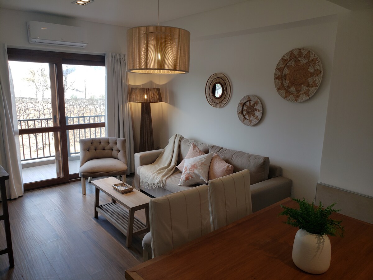 Relaxează-te în acest spațiu confortabil, la câțiva metri de Route 40 și confortul de a fi aproape de atracții, restaurante și crame locale renumite. Apartamentul are tot ce ai nevoie pentru a-ți face șederea o experiență unică. Ideal pentru cupluri. De la balcon vă puteți bucura de priveliști panoramice care surprind esența Cafayate, înconjurată de munți impunători și podgorii care pictează peisajul.