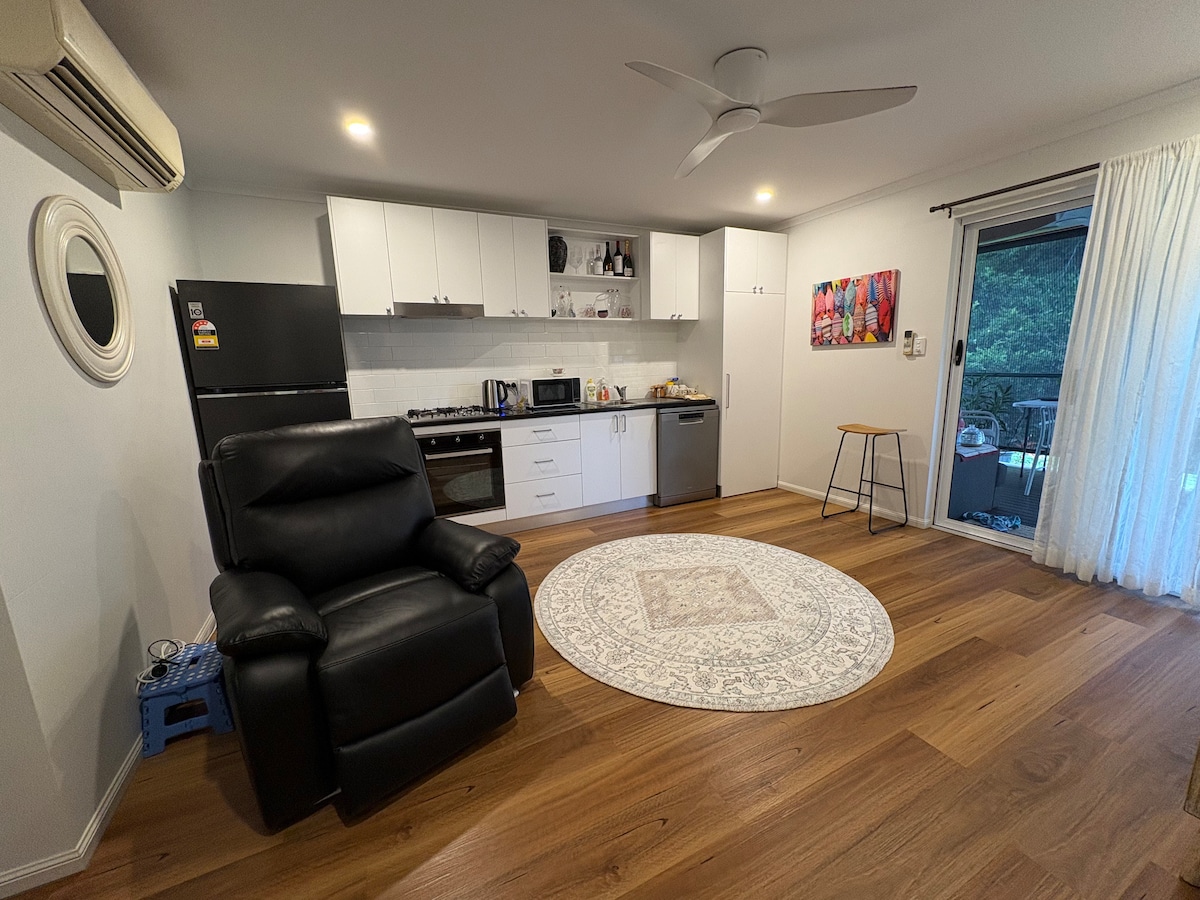 Welcome to Sanctuary on Mazlin. your ocean-inspired home away from home. This tranquil, self-contained retreat reflects the spirit of the Great Barrier Reef through coastal décor & award-winning underwater photography by your host, Libby. Designed for tropical comfort, it features spacious open-plan living, ceiling fans throughout, cooling breezes, & an air-conditioned bedroom. The living area opens onto a covered deck overlooking the pool and garden, where guests enjoy a quiet place to relax.