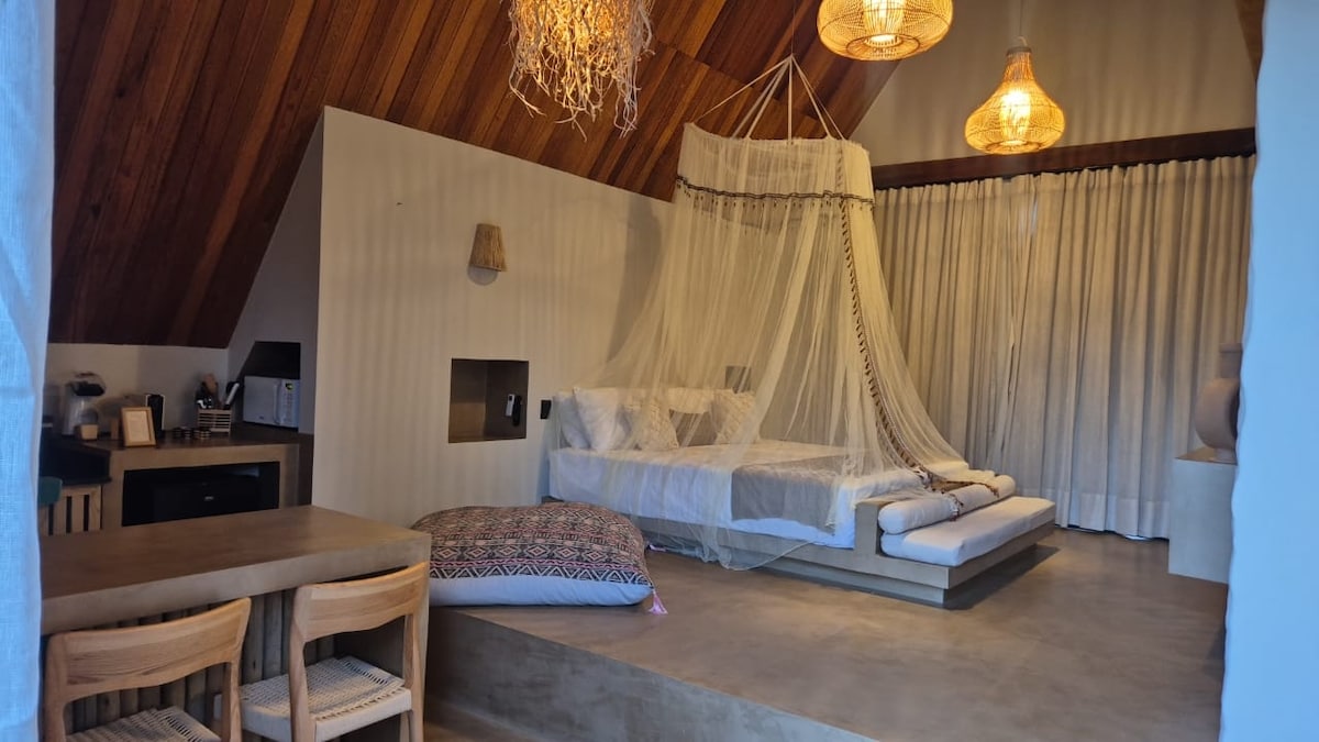 Cu mândrie, prezentăm casa noastră nou construită, amenajată la un standard minimalist. Aici vei găsi liniște în inima orașului Morro, înconjurat de natură luxuriantă. Aptos cu bucătărie completă, living, dormitor cu baie proprie și un balcon acoperit, ideal pentru relaxare într-un hamac. Ne aflăm în partea centrală a orașului Morro, la doar 7 minute de prima plajă și la 5 minute de animata Rua da Praia, plină de restaurante și cafenele.