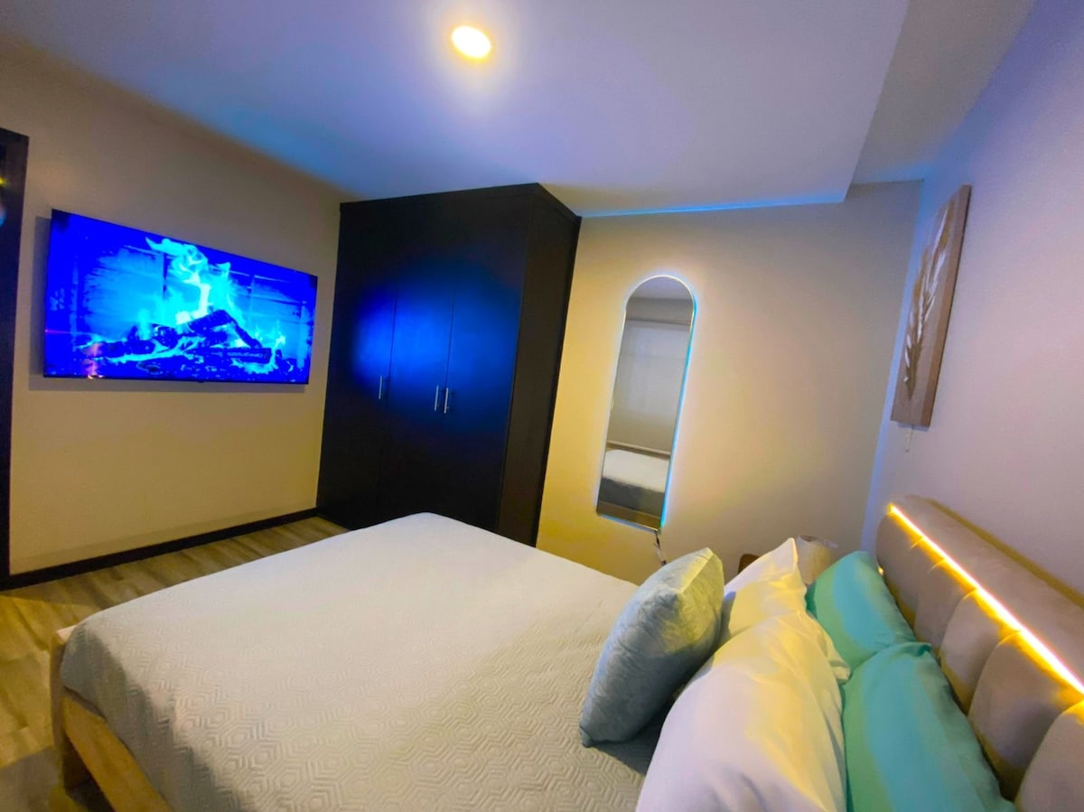 Suite acogedora y bien equipada, ideal para una estadía cómoda y tranquila. Cuenta con dormitorio amplio, ropa de cama confortable, clóset con toallas, sala con sofá-cama cómodo, y kitchenette funcional con microondas, cafetera, nevera. Espacios limpios, iluminación cálida y acabados en madera que brindan una sensación de hogar. Ubicación estratégica, perfecta para descansar o trabajar con comodidad. Cerca del estadio, el centro histórico, el aeropuerto y plazas comerciales.