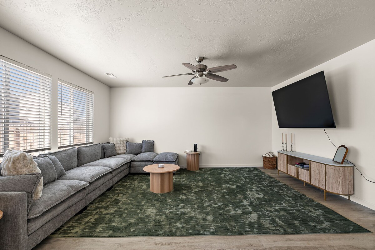 The Modern Farmhouse was recently remodeled with upscale amenities and everything you need for a comfortable stay! Enjoy your own delicious home cooked meals in the beautiful kitchen, gather in the dining room with seating for 8, enjoy a movie on Netflix or Disney+ on a huge 65" OLED 4K TV and 7.2 Klipsch Surround Sound with a large sectional providing seating for the whole family. Outside on the back patio you will find outdoor seating with a fire pit, a hot tub for 5, and a 6 burner BBQ.