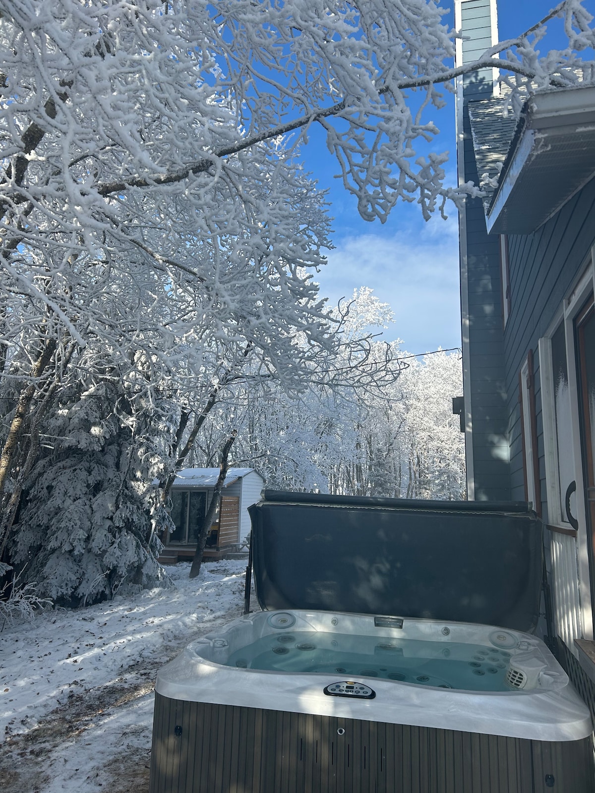 Bine ai venit în cabana noastră confortabilă construită pentru două persoane! Bucură-te de decorul minunat al acestui spațiu relaxant. Amplasată printre copaci pe o proprietate frumoasă de 5 acri, această căsuță îți va fura inima. Sunt incluse halatele și papucii de orice fel pentru cada cu hidromasaj! Acces la toate facilitățile, inclusiv cada cu hidromasaj, vatra de foc și veranda acoperită din față cu vas de foc. O oră până la Banff și munți. Relaxare. Pace. Și numai vibrații bune. **Reține că nu există duș disponibil**
