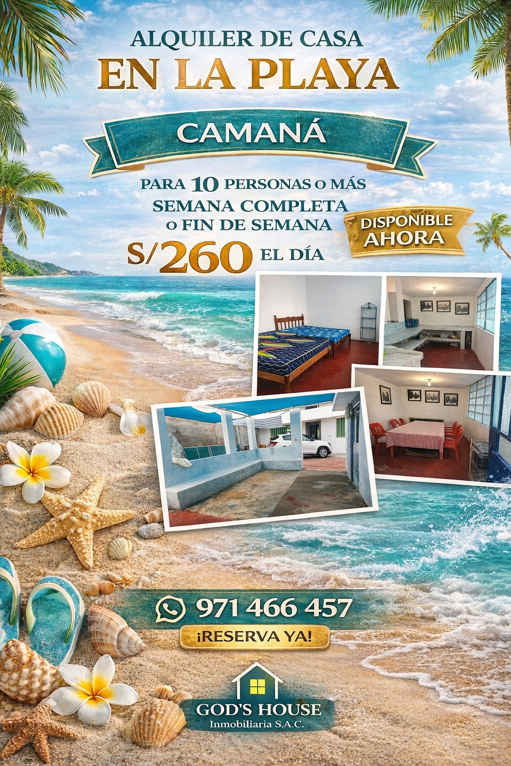 Casa mare de pe plajă este închiriată în apropierea parcului acvatic - Camaná * Complet mobilat * bucătărie implementată * Piscină 8×4 și patină pentru copii * Zonă de grătar cu cutie chinezească * Zonă de joacă (taca taca, leagăne, broască etc.) * Spălătorie cu autoservire cu autoservire * 4 dormitoare și 4 băi. * Desablatoare * Garaj pentru 4 vehicule * Wi-Fi și DirecTV * Apă caldă cu boiler solar și electric