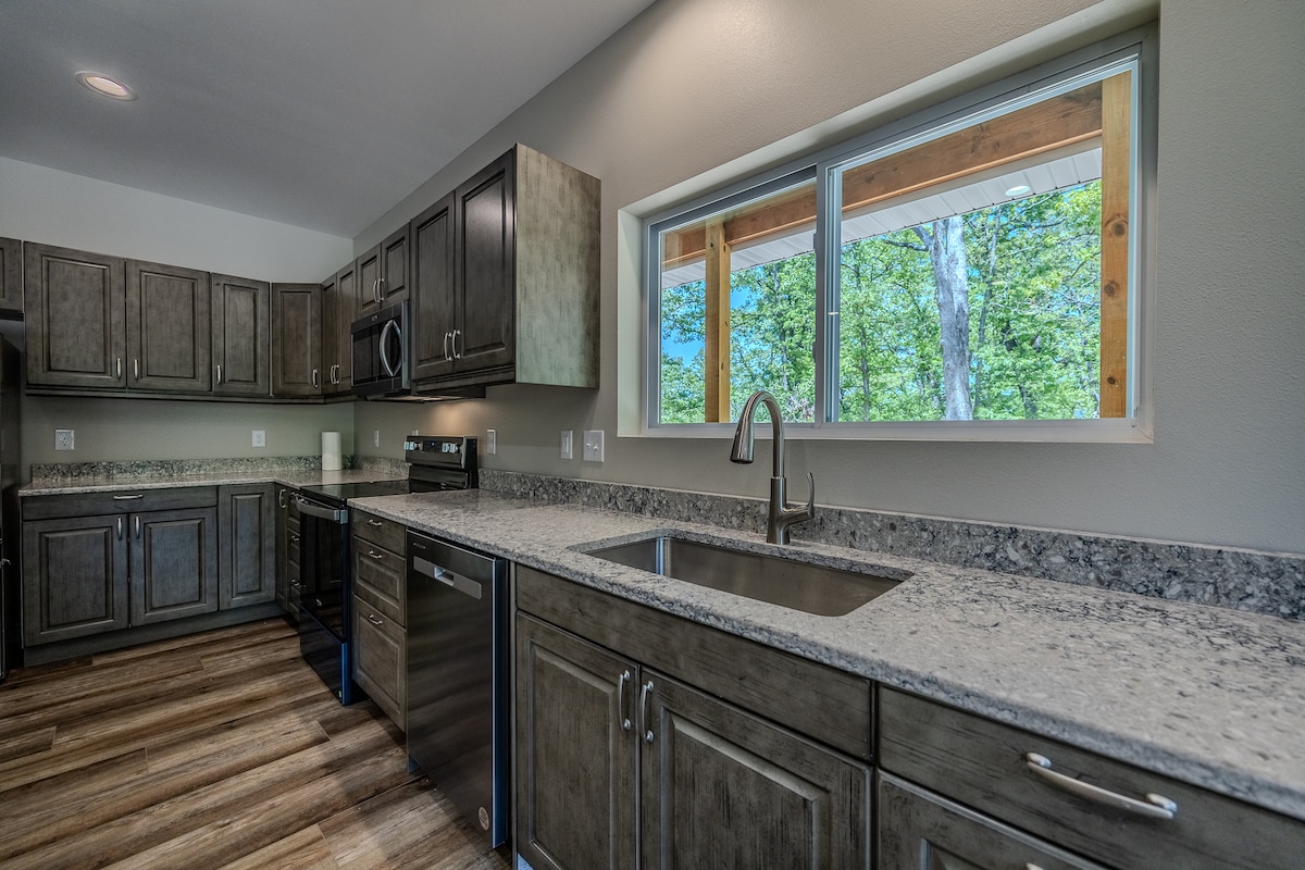 Bine ai venit la Ha Ha Hideaway! Ascunsă printre copaci, cu vedere la lac, această locuință are 5 dormitoare, 4 băi și poate găzdui până la 14 oaspeți. Locuința îmbină designul modern cu căldura unei cabane clasice. Fiecare detaliu, de la texturile de catifea și iluminatul ambiental, creează o atmosferă sofisticată, dar primitoare. Afară, bucură-te de o baie în cada cu hidromasaj privată, în timp ce te bucuri de priveliștea lacului.