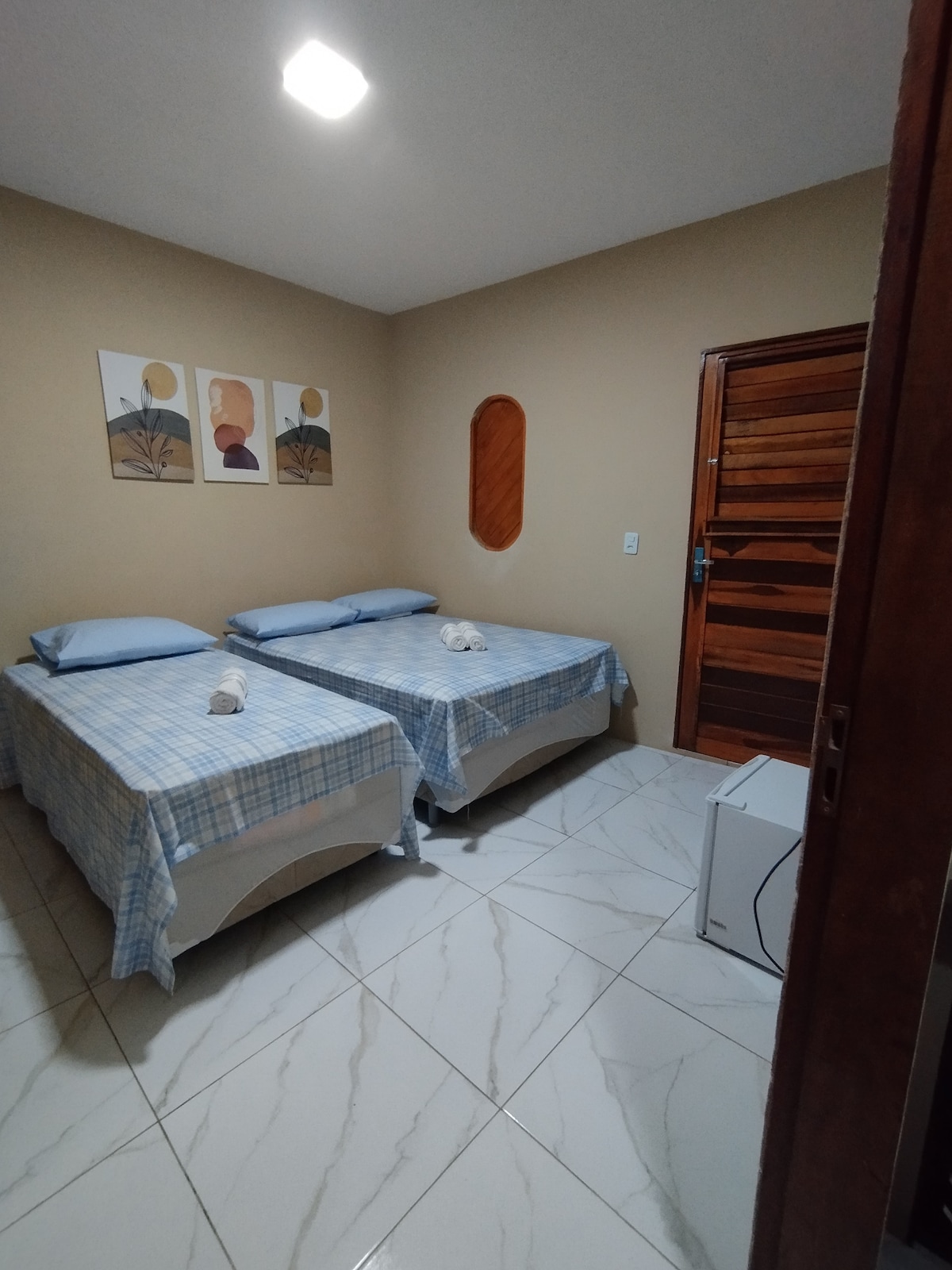 Relaxează-te cu întreaga familie în această cazare liniștită. Bucură-te de o zonă mare în aer liber, gazon, piscină, excelentă pentru copii și animale de companie, precum și de terasa pentru grătar, grătar, frigărui, bucătărie cu frigider, fogao, cuptor cu microunde, blender, aparat de făcut sandvișuri, oale, vase, tacâmuri, xicaras și pahare și confortul a 3 apartamente cu aer condiționat pentru un somn odihnitor. Trezește-te cu vântul pe paiele cocotierilor sau privește stelele după lăsarea întunericului și auzi liniștea acestui loc.
