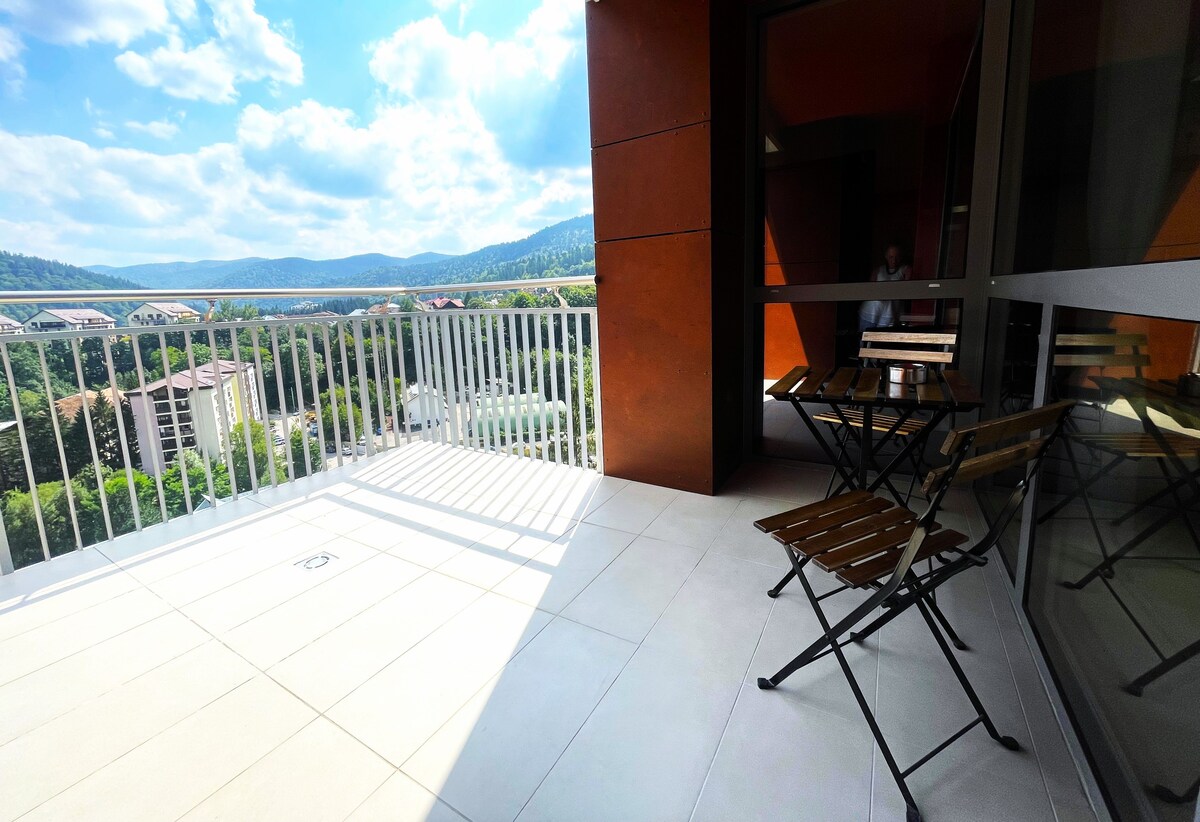 Studio încântător într-o locație confortabilă și liniștită între munți. Apartamentul are internet de mare viteză, bucătărie complet utilată, o baie modernă, un balcon cu vedere splendidă la munte și un loc de parcare subteran privat. Clădirea și mobilierul de acasă sunt noi. Apartamentul este dezinfectat profesional după fiecare vizită. Casă inteligentă - acces ușor prin cod. Acces SPA (piscină și saună) la 20 euro/3 ore sau 30 euro/zi Restaurant și bar la parter. Clădirea este protejată non-stop.